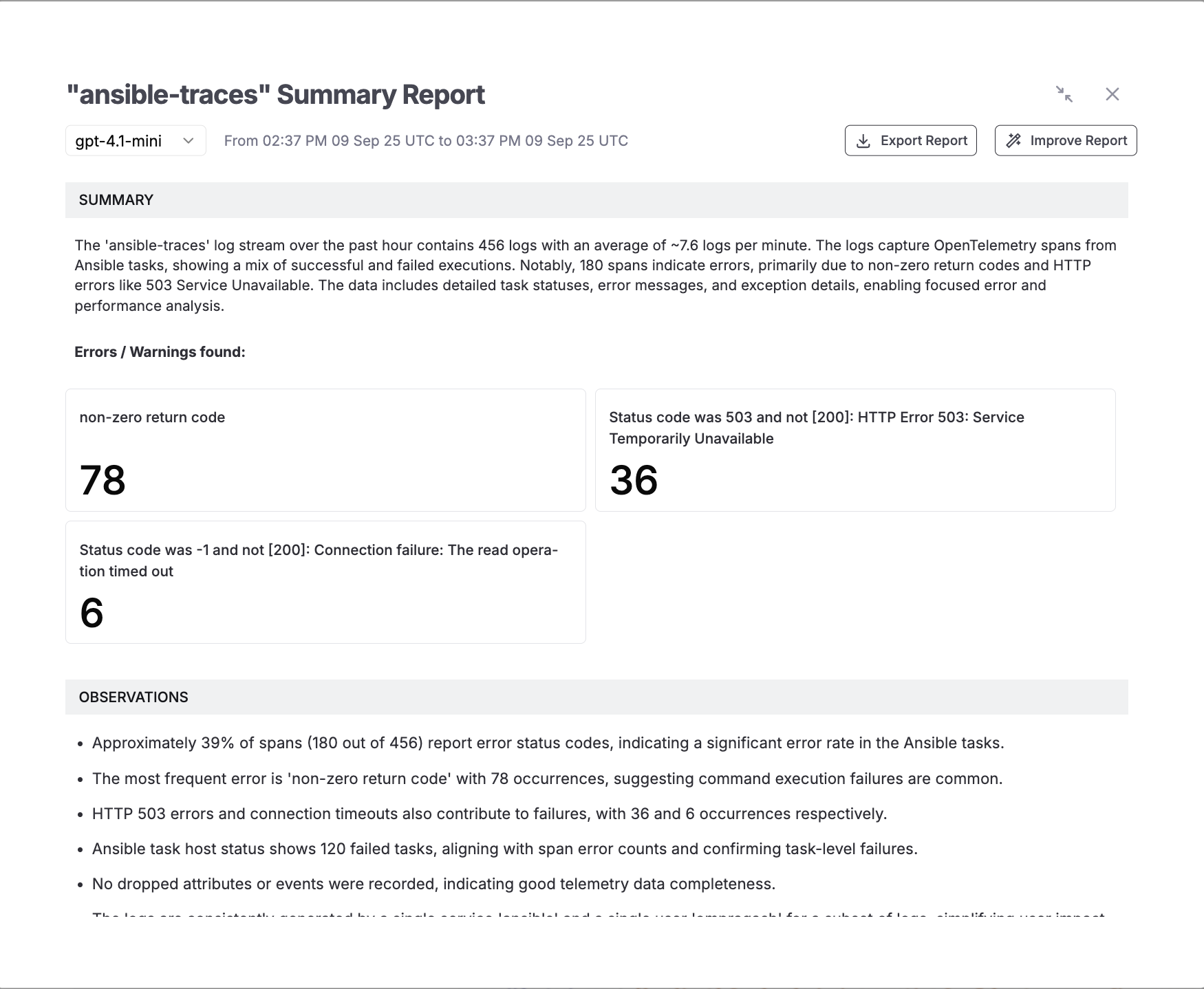 Turn any noisy time window into a crisp, executive‑ready report. Parseable’s AI summarization reads the logs or traces you’re viewing and produces a natural‑language summary with error counts, highlights, and actionable observations.