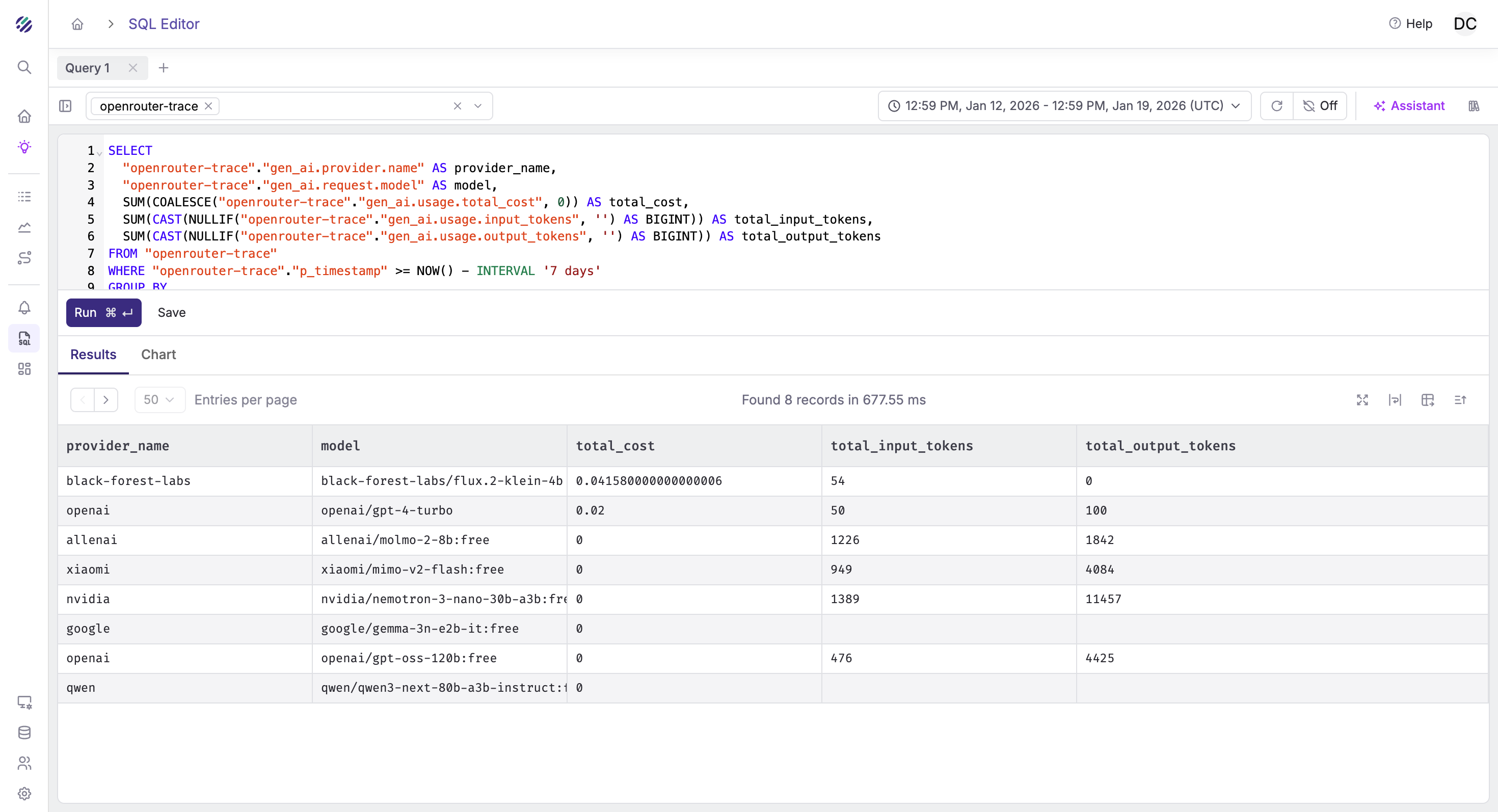 SUM(CAST("gen_ai.usage.cost" AS DOUBLE)) AS daily_cost