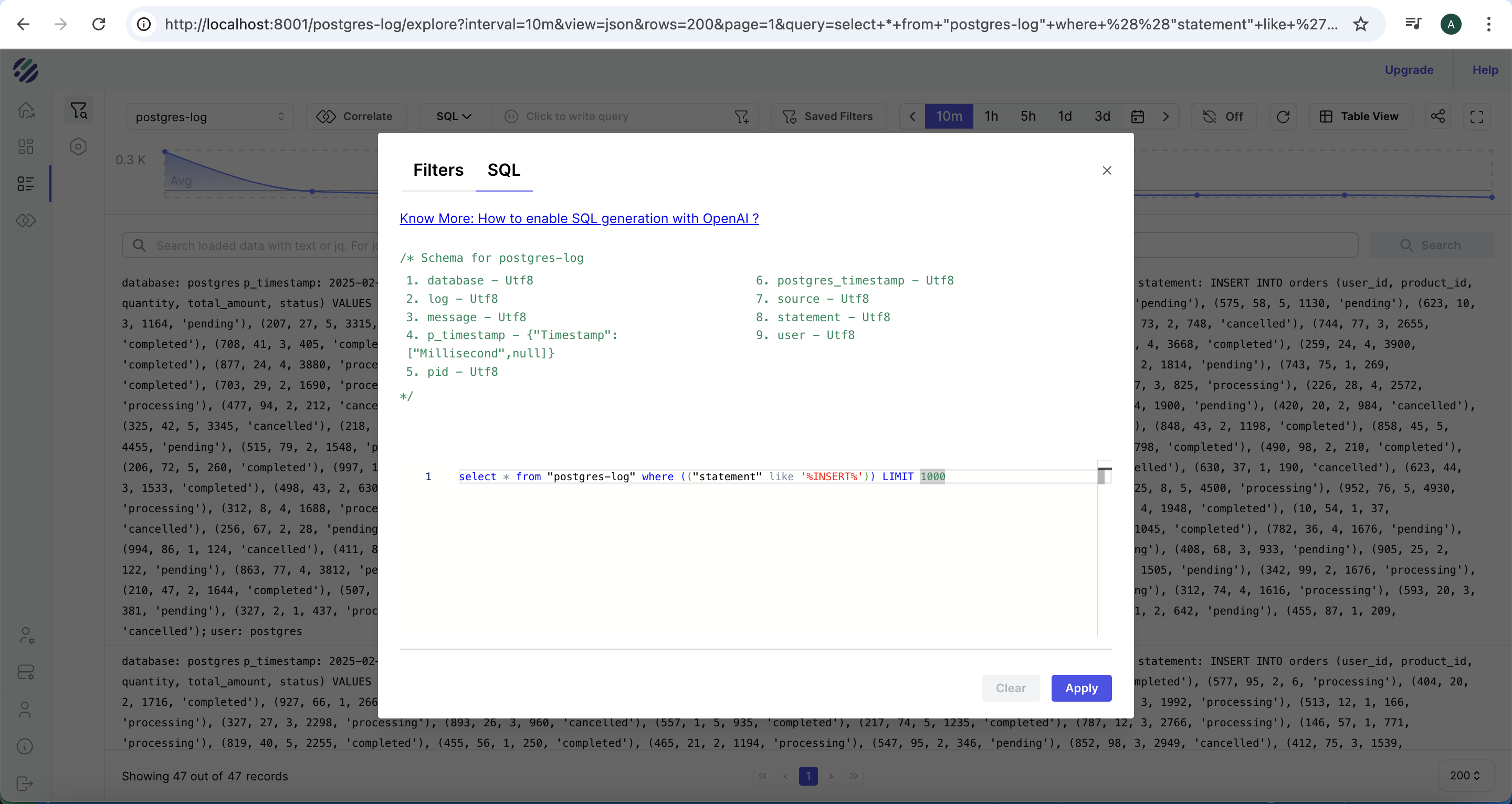 At this point we have our PostgreSQL logs as well as our metrics within Parseable. Now lets generate some queries in PostgreSQL and see how are logs are getting parsed within Parseable.